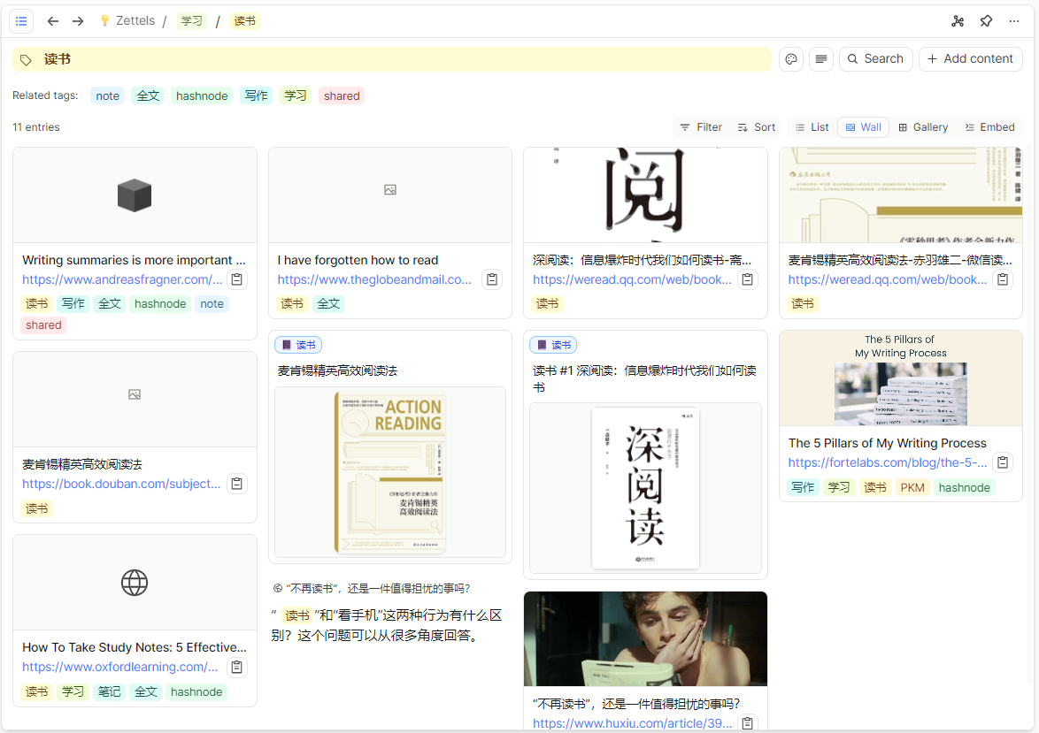 例如,我建立了例如读书、写作等不同的Object,分别添加了一些与读书有关的内容,都添加了读书这个tag,读书有关的内容是分散在不同的地方的,如果是notion,那么就很难把这些内容串联起来,在Capacities里面,点一下读书标签,所有打了读书tag的内容都展示出来了。