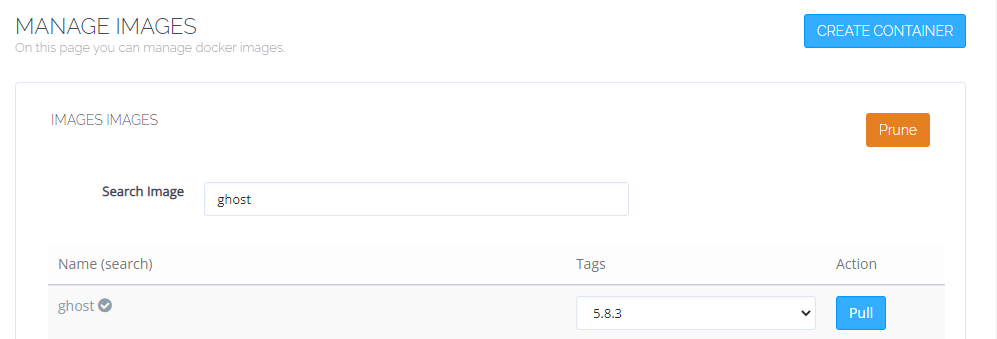 1.首先找到Docker Manager,然后找到Manage Images,在搜索框搜索Ghost,在下方弹出的多个栏目,找到第一个官方Image,然后在Tag位置,点击下拉框,选择最近的版本,建议选择数字最新即可(不要选latest,后期容易搞错),然后点击旁边的Pull,等待下载完Image后进入下一步。
