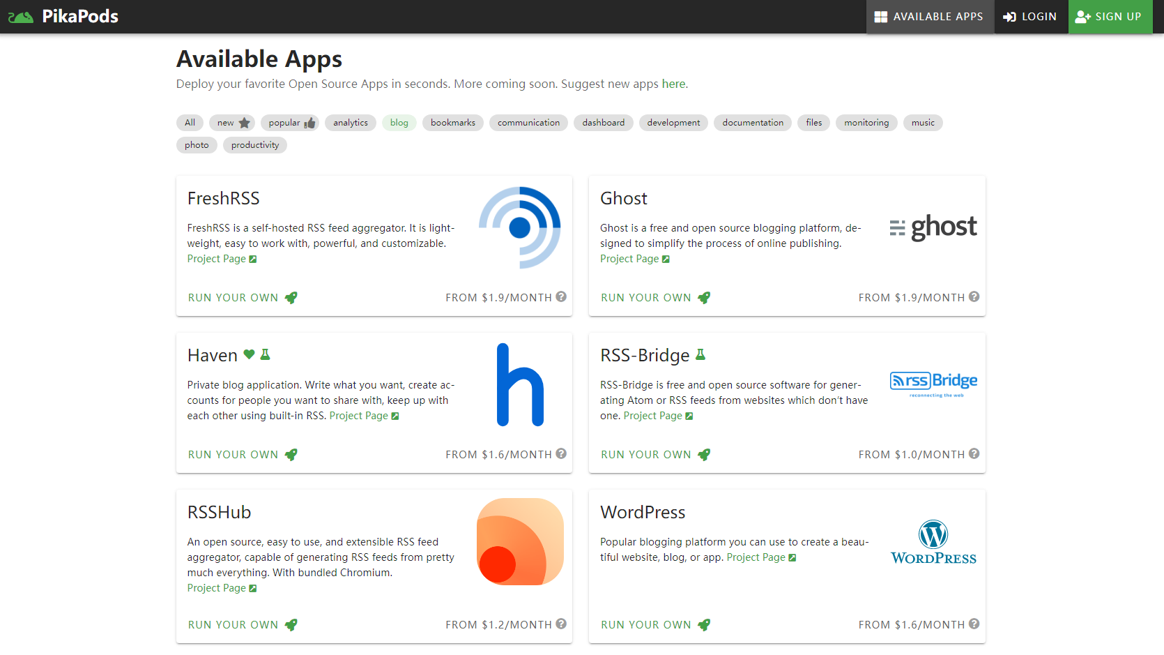 PikaPods可以一键运行开源应用程序,目前有几十款程序可以直接运行。
