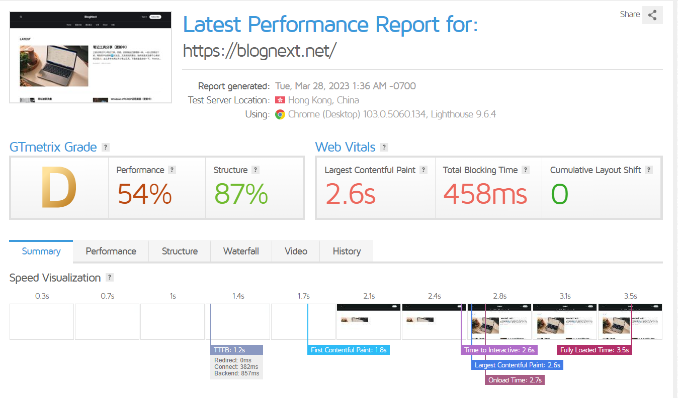 其实这个测速,有一个很大的问题,就是过度夸大了1秒2秒带来的体验上的差距,其实1秒2秒真的没有太大的区别,但是反应在量化的指标上,确是巨大的差距。还有一个问题,就是测速工具对Ghost的主题非常敏感,不同的主题测试结果差异很大。例如,下面就是使用Headline、在香港的服务器测试的结果,测试稳定性差,成绩波动大,好几次都是没法见人的那种差,3.5秒加载完成,其实体验也没有太糟糕吧。